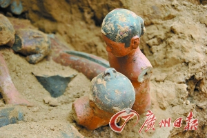 段毅介绍说,其制作时分头颅、躯干、腿、脚四大段模制而成,脸部的五官则是后期刻划而成,故表情各异,丰富而生动,神态各异,陶俑表面施橙红色彩或白彩陶衣,头发、眉毛、眼睛、胡须等绘为赭黑色,嘴唇多以朱红描绘,均经过焙烧,色彩附着较好,虽历经两千余年,有些色彩依然鲜亮如初。